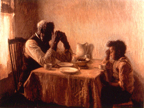 Reminiscent of Henry Ossawa Tanner’s painting “The Thankful Poor,” humility and reverence makes this an attractive scene.